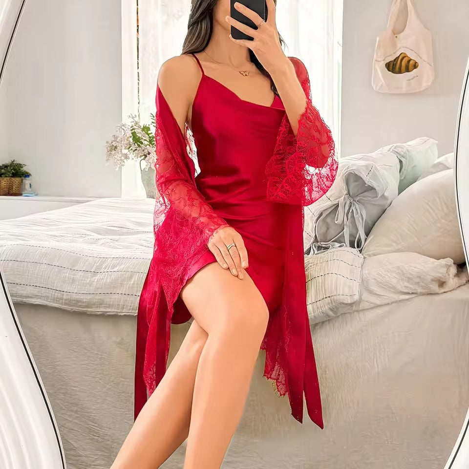 Satin Nightgown with Lace Robe – Women Two-Piece Sleepwear Set